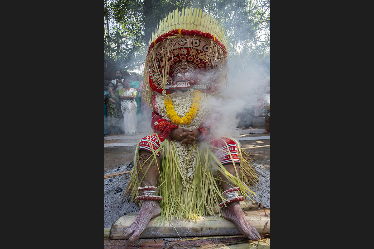 In the north of Kerala, the Teyyam, a deformation of Devam meaning God, is without doubt the most extraordinary and the least known of the dance dramas of south India. From December to May, during the dry season, the divinity will manifest itself in many differing forms in the numerous ‘kavu’, small forest sanctuaries built in the enormous coconut plantations along the Malabar coast. The performers are all untouchables, belonging to the lowest caste. But many hours of make-up, the recitation of the chosen divinity’s myth, the rhythmic trance of the drums, the use of fabulous costumes and head-dresses, will slowly transform them into gods of a terrifying aspect. This archaic religion, whose origin is lost to the depths of time, will allow an entire community to overcome its fears and to appropriate a protective and consoling divinity.